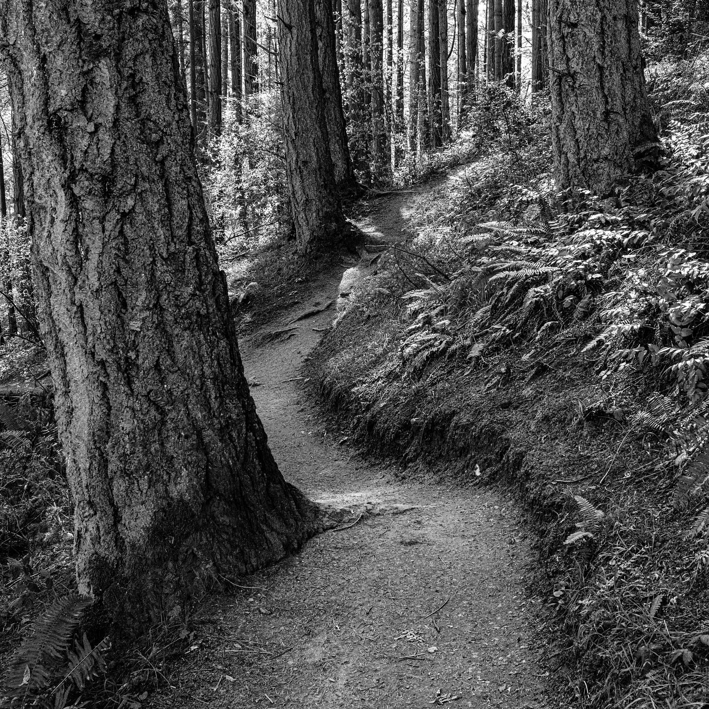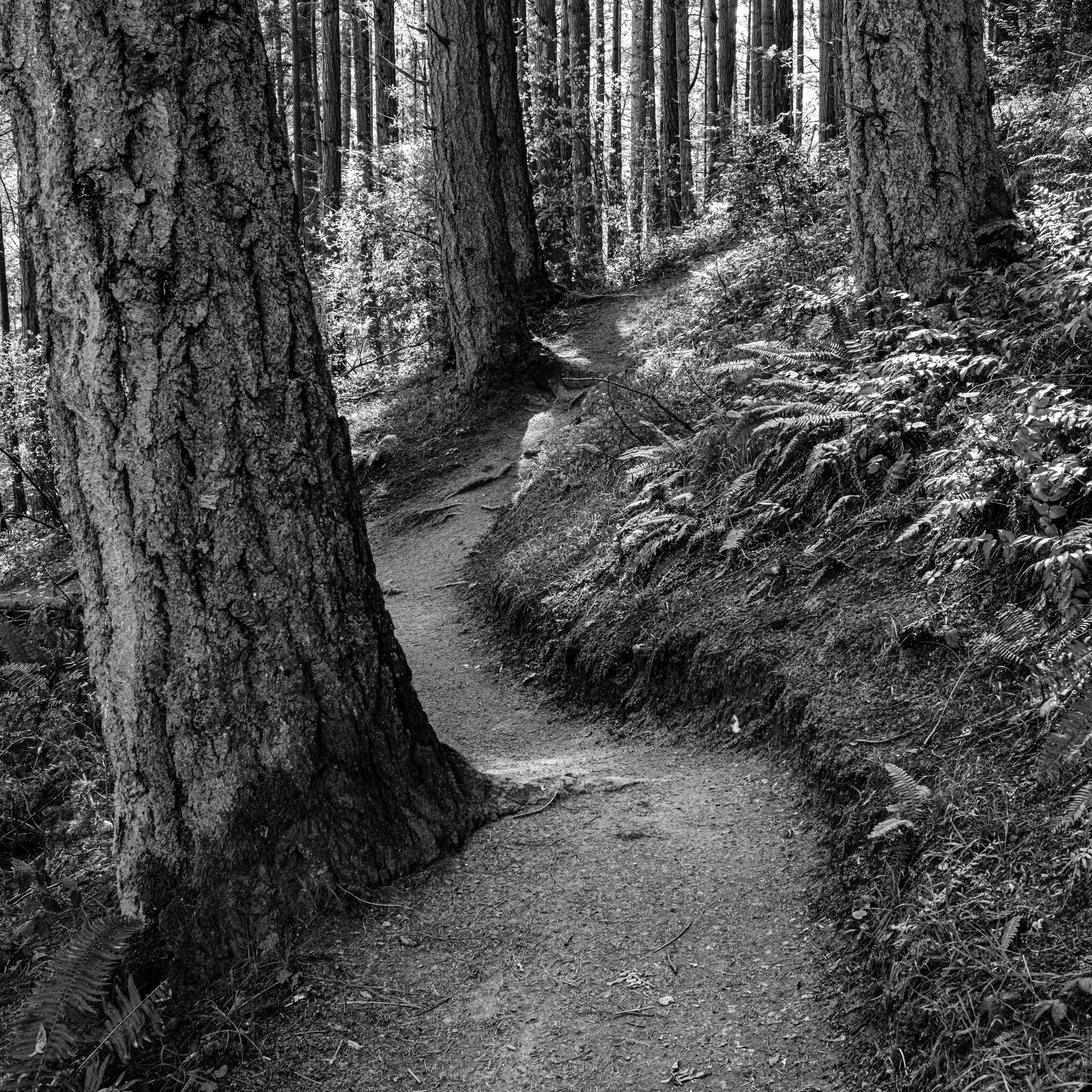 Above the heavy canopy has muted the light and dulled the shadows. This makes the path more inviting and feels less like a walk in the dark woods. Paths have their own structure and story. Trodden over decades or generations they invite us to wander over their well-worn twists and turns.