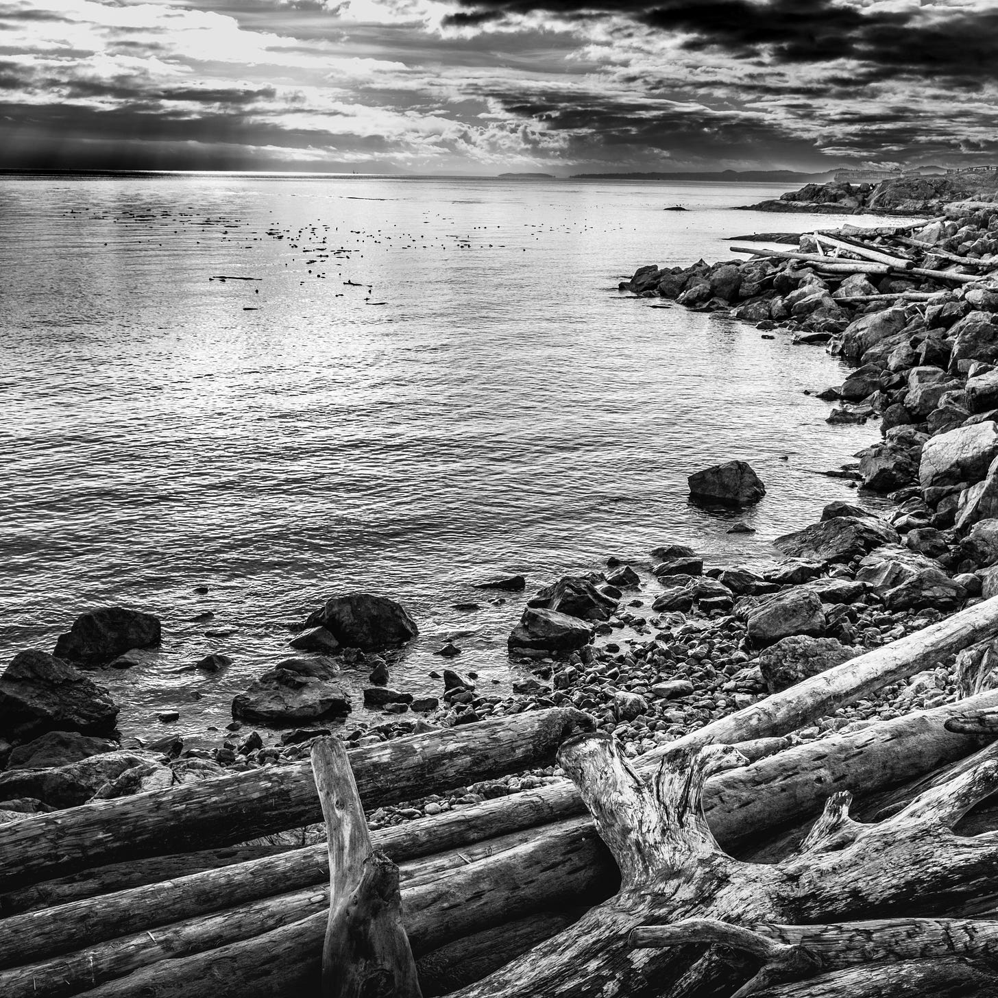 The photo above has all four in a perfect balance. We are drawn into the photo by the light in the upper left corner, then cross the sky, curving down and to the left through the water, then back to the right and up over the logs. The light softens in intensity as the eye moves over the photograph. The shadows contrast with the light in the belly of the clouds above the horizon, on the rocks at waters edge, and between the logs. The structure of the composition carries the eye across the clouds and diagonally down to the shore where the rocks of the jutting shoreline direct the eye back across the water to the reflected sunset that pulls the eye down to rocks and logs in the lower left corner. And the logs guide the eye across and up to the sky again. The story of the earlier storm, that tossed the logs violently upon the shore, is contrasted with the calm of the water at sunset. What was once violent is subdued.