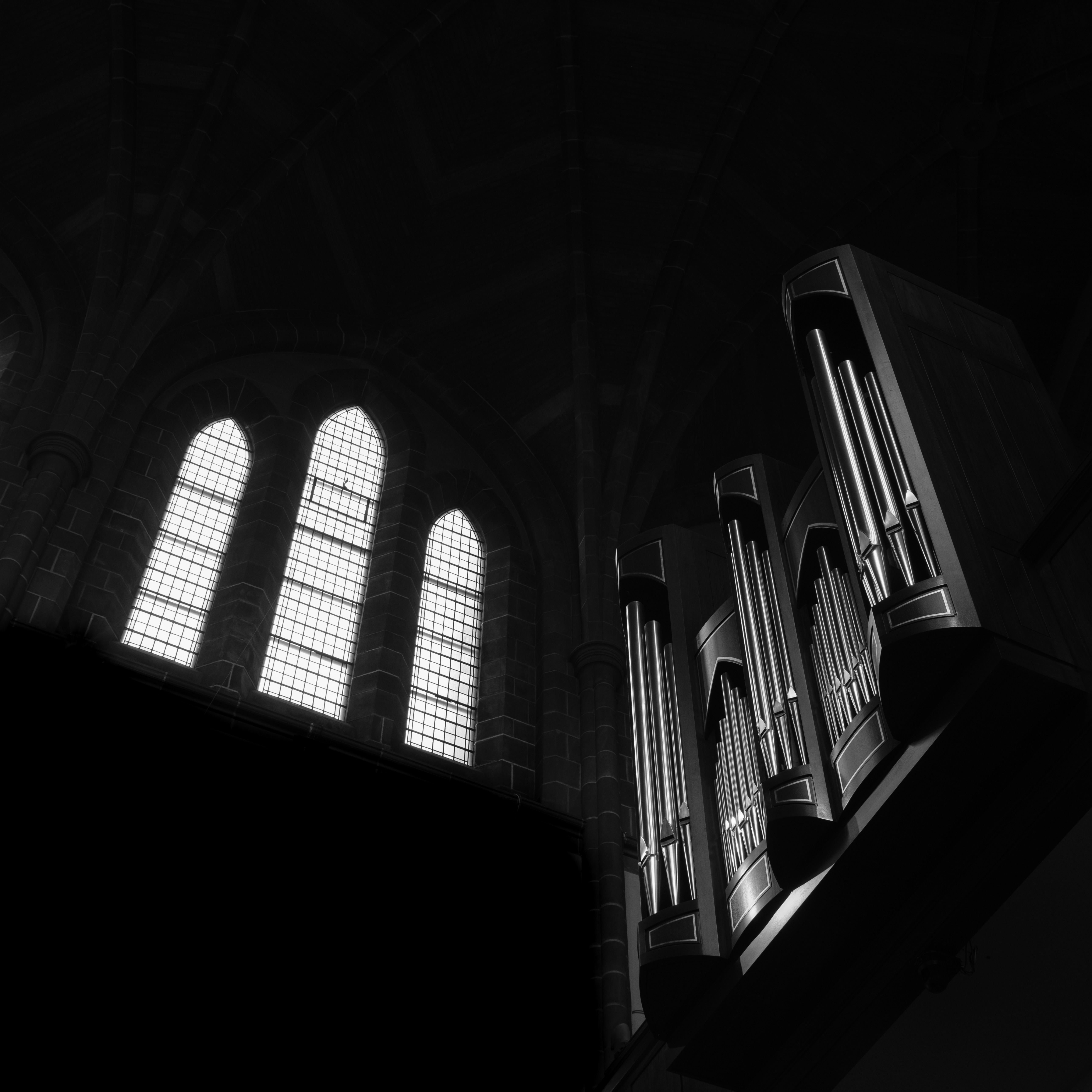 This minimalist image is full of shadow, and makes the light of greater value. The diagonal structure focuses the eye like a funnel to the details of line. Did the light call the music or the music call the light?