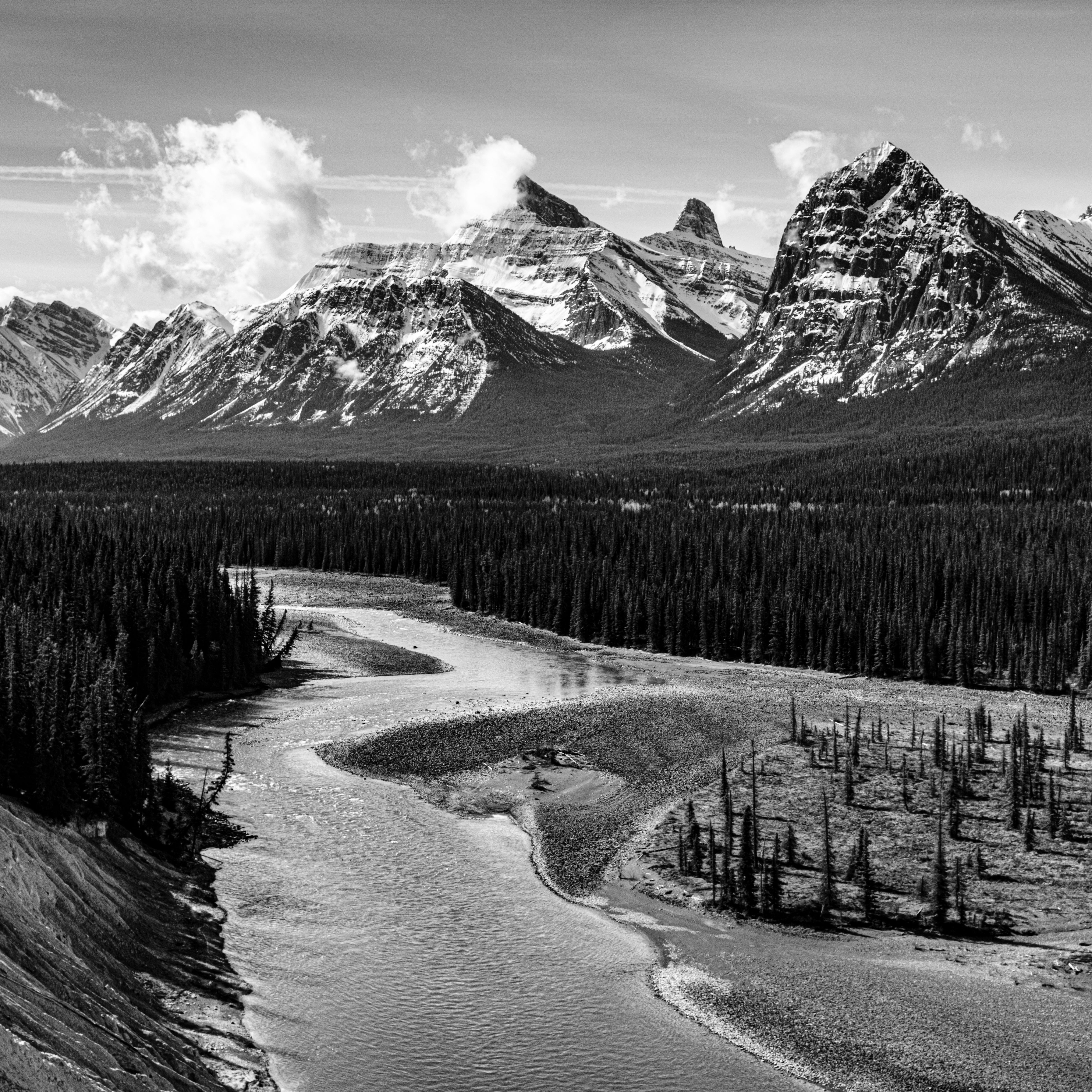 Grand vistas change at different heights. If this had been taken from the valley floor the mountains would have greater majesty and the observer would feel more humility. If it had been taken from a higher peak the world would be grand in scope yet feel diminished to the observer in majesty. The viewer would seem more god-like. Here at mid-height we have more of the later and less of the former. An individual walking down alongside the river would look like an insect. Without a human comparison, the trees are more like sprigs of grass. I prefer the humbled viewing from the valley where the trees and mountains are majestic and I feel more a part of nature, rather than superior to it.