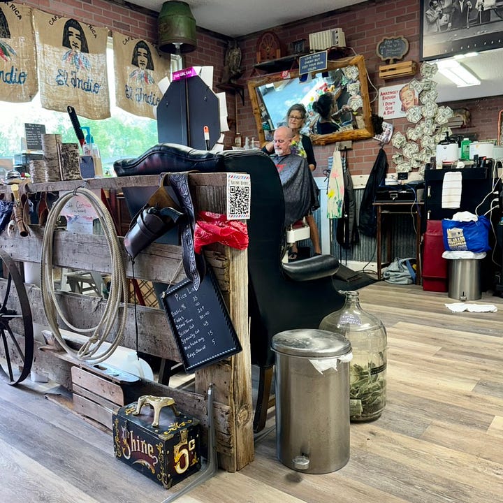 I needed a haircut or a trim and a few doors down was a barbershop. On the low partition wall as you enter the shop hung a half dozen cowboy pistols in holsters. The walls held dollar bills, posters of John Wayne and memorabilia from past decades. My first thought was the guns were the patrons, but that was soon dispelled when looks closer.