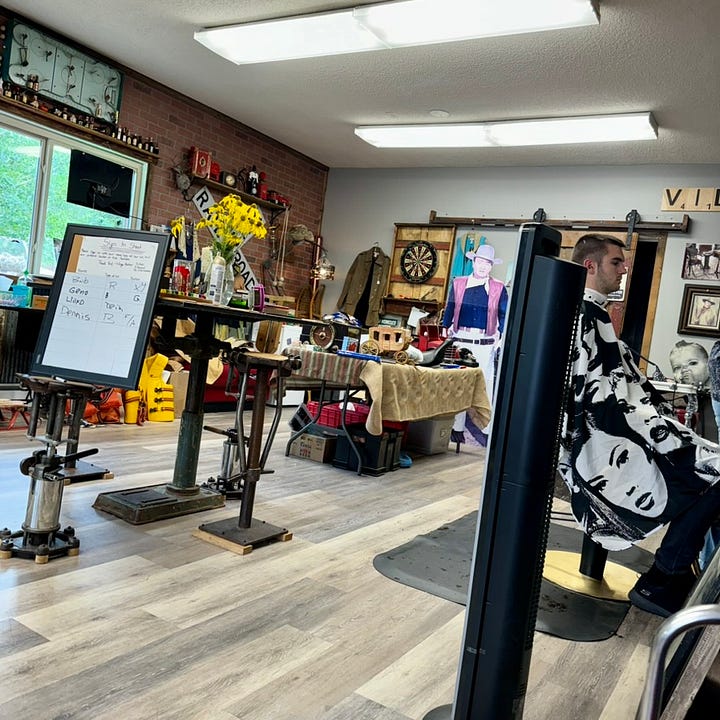 The two barber chairs were in opposite corners with antiques filling the floor space. Three straight-back chairs sat against the wall by the door, two were empty. Welcomed as I entered by the nearest of the two lady barbers. I began to sit down and she called over Steely Dan on stero, “Sign in with what you want.” She nodded her head toward the white board propped up against an antique table in the centre of the shop. “A trim,” I said and she nodded again toward the white board. I wrote “Lloyd” in the first column and trim in the second. But I did not know what the letters were for on the third column and left it blank.
