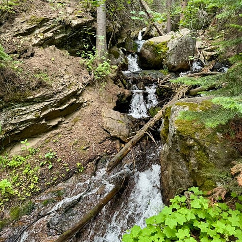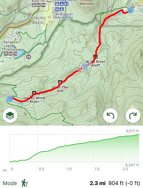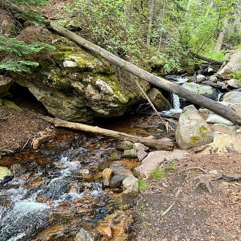 After the first half mile the trail ascends to 9071 feet. This was a lovely day hike. At the end of the trail a large log made for a perfect place to take a water break. The trail is a favourite of horse-back outfitters. I stepped aside several times to let a group of tourist riders pass.