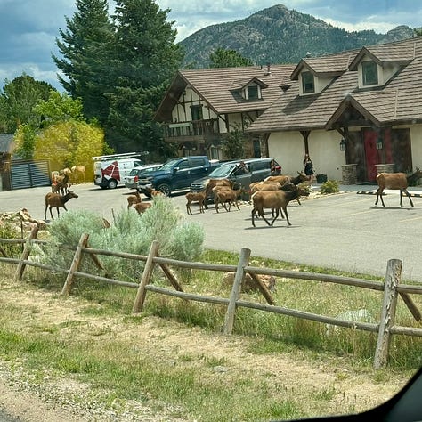 As I drove back to were I camped, traffic stood still because a herd of elk and young calfs were passing through. A mother was feeding her calf in the middle of the road. Neither had any concern for the traffic jam. When the calf felt satisfied, they joined the rest strolling through a parking lot. Seemed they were all on their way to the famous Big Thompson River.