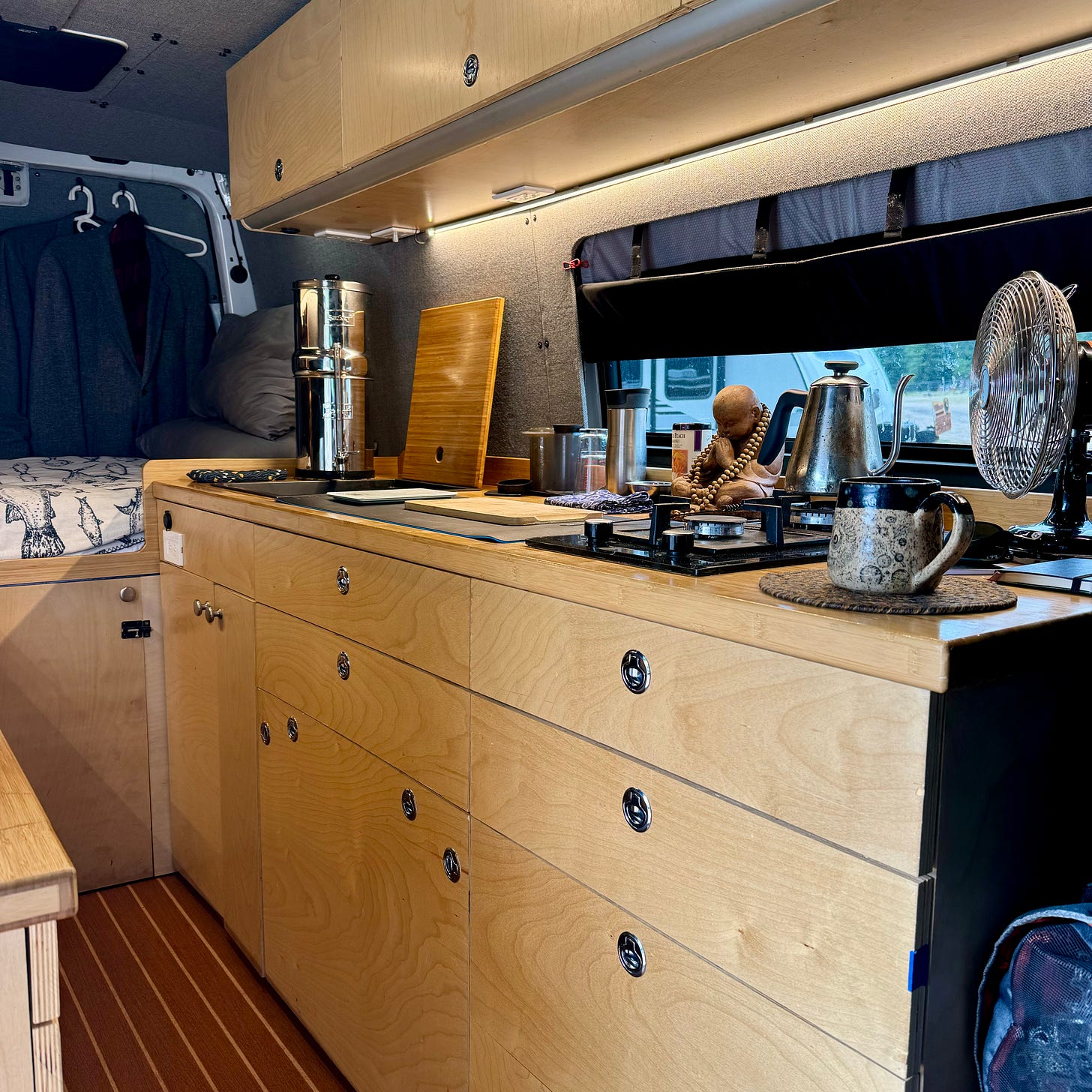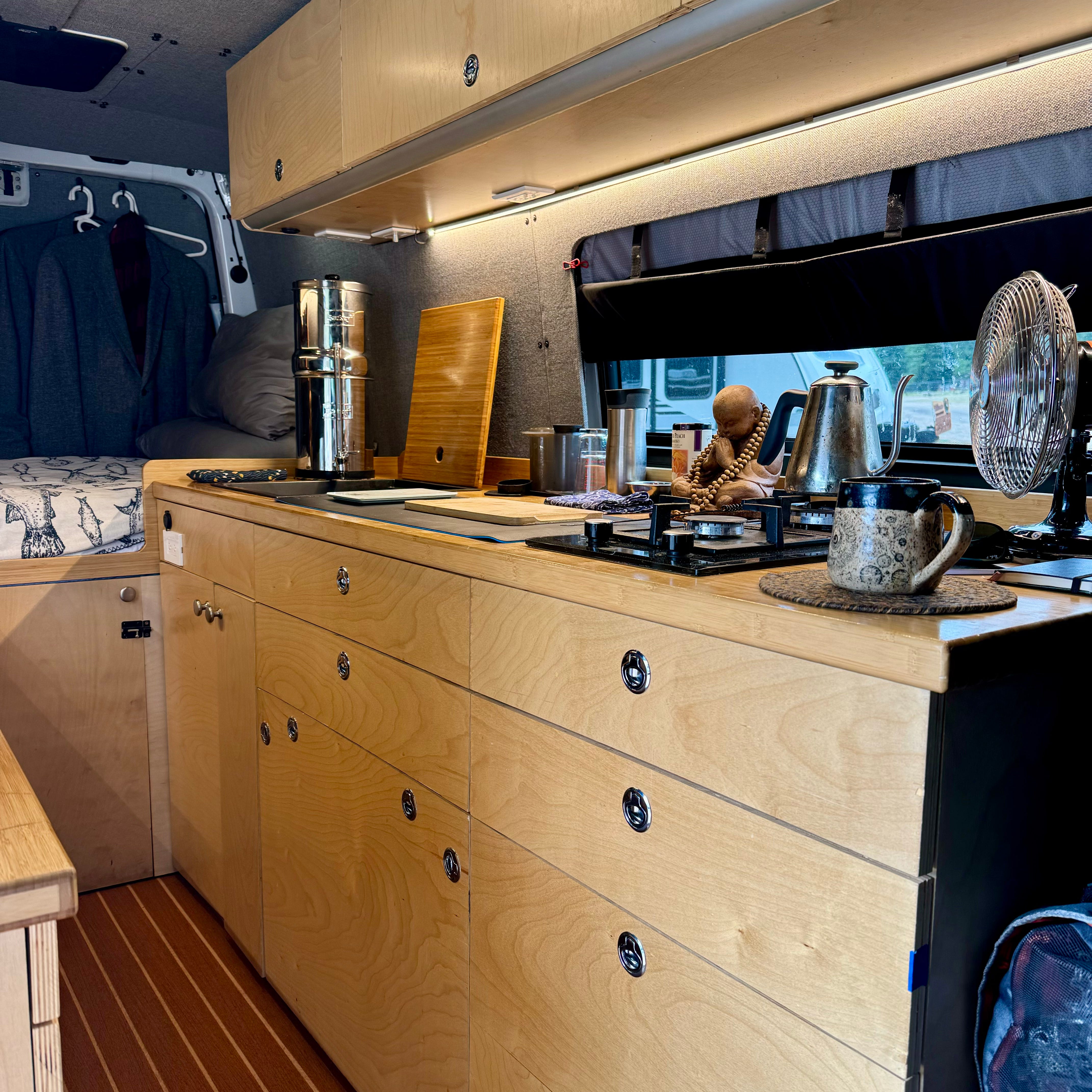 I spent the morning gutting and removing my original water system. The old military-grade five gallon plastic jerry cans fit nicely under the sink, but were a pain to handle after filling. I loved the Berkey Travel Water Filter System Pamela had and bought the Travel model because it fit nicely on the counter. I replaced the two 5-gal jerry cans with four 3-gal stackable Sagen Life AquaBrick Water Storage Containers under the sink. They are easier to handle and give me better storage options. I use an inline filter on the hose when I fill the container and then the Berkey system has dual element charcoal filters and additional dual element fluoride and arsenic filters. This is the best rated passive gravity-feed water filter system I could find. When you realize that no municipality in North America passes the 1960’s pure water standard, finding a way to filter it further becomes important. If you are currently buying bottled water, your savings will pay for the Berkey.